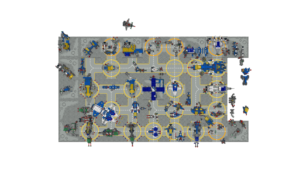 Am ersten Novemberwochenende fand in Thayngen die KlötzCHenwelt 2017 statt und ich hatte zum ersten Mal die Gelegenheit meine fast komplette Sammlung der Öffentlichkeit zu zeigen. Als Vorbereitung habe ich mir einige Layouts für die Basis überlegt und auch noch etwas in Bausteine für Halter für die Raumschiffe investiert. Das ursprüngliche Layout war die Alpha-Basis, wie angedacht: