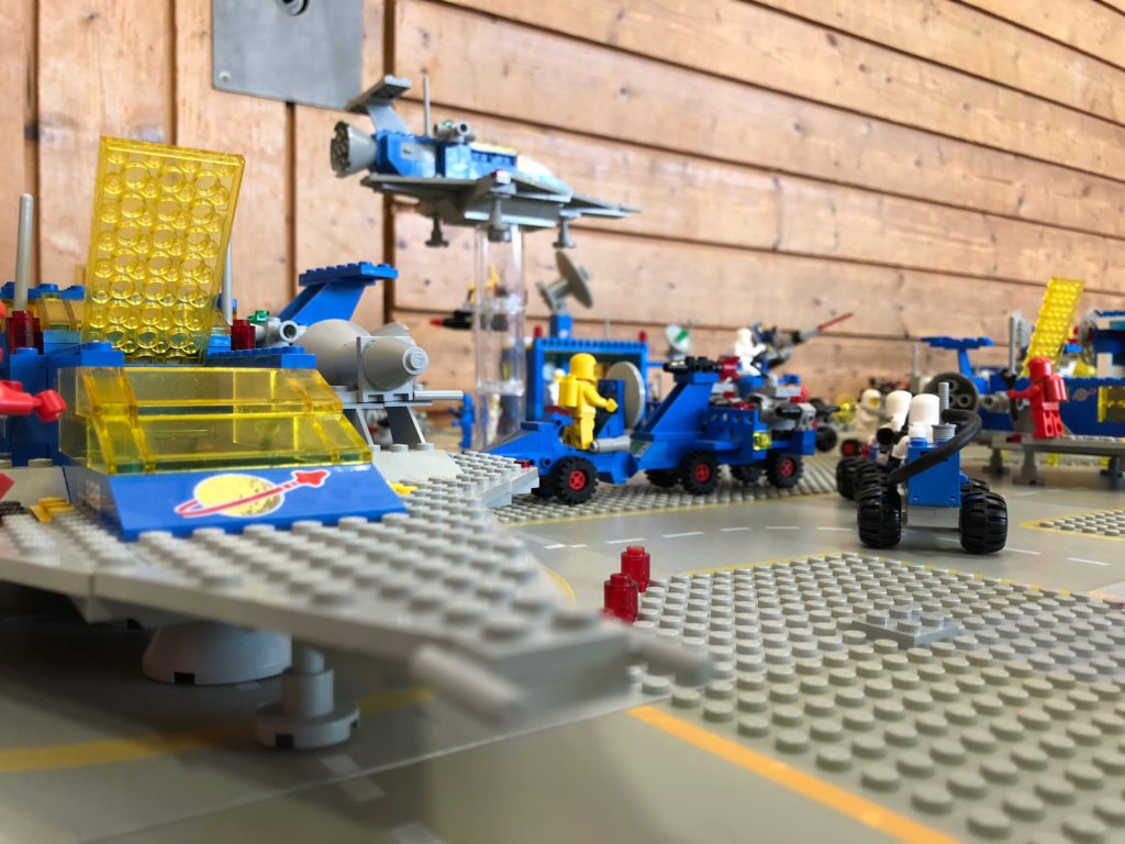 Recht schnell stand das Grundlayout mit der grossen Basis und der kleineren Seiten-Basis auf dem Ausstellungstisch. Leider mussten dann Sara & Rebecca wieder gehen und ich dürfte den Aufbau allein fertigstellen. Was noch fehlte, war die Raumschiffe „fliegen“ zu lassen und die Astronauten in Bewegung zu bringen, d.h. irgendwelche kleinen Szenen darzustellen. Ich denke, dass mit dem Fliegen ist gut gelungen, dass mit den Szenen weniger. Sah am Ende aber trotzdem super cool aus: