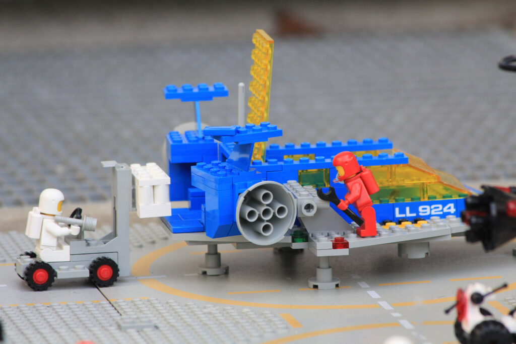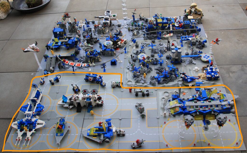 - Auf der einen Seite (im Foto der rechte Teil der Basis) befindet sich der kleine Raumhafen mit Landefeldern, Straßen und der Anflugkontrolle (Die kleine Basis vom LL-928 Set). Als Raumschiffe sind vor Ort der LL-928, der Eagle, LL-924, LL-918, der Sound Transmitting Crusier und der Galaxy Commander. Im Anflug ist das kleine Shuttle und im Abflug der XT Starship. Der Raumhafen ist vor allem als Operationsbasis für die weitere Erkundung des Planten gedacht und wurde nach den Anlagen für die Mineraliengewinnung erstellt.